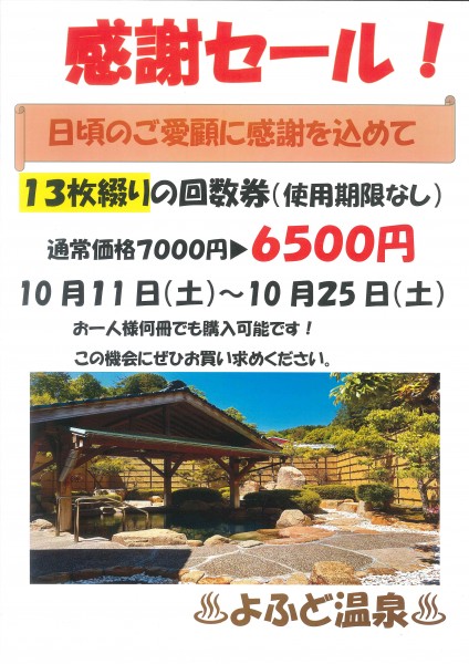 いつもよふど温泉をご愛顧いただきありがとうございます。 感謝の気持ちを込めてお得な回数券の感謝セールを開催します! この機会をどうぞお見逃しなく(^▽^)/