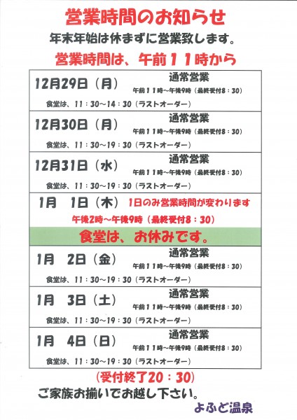 年末年始 営業時間のお知らせ