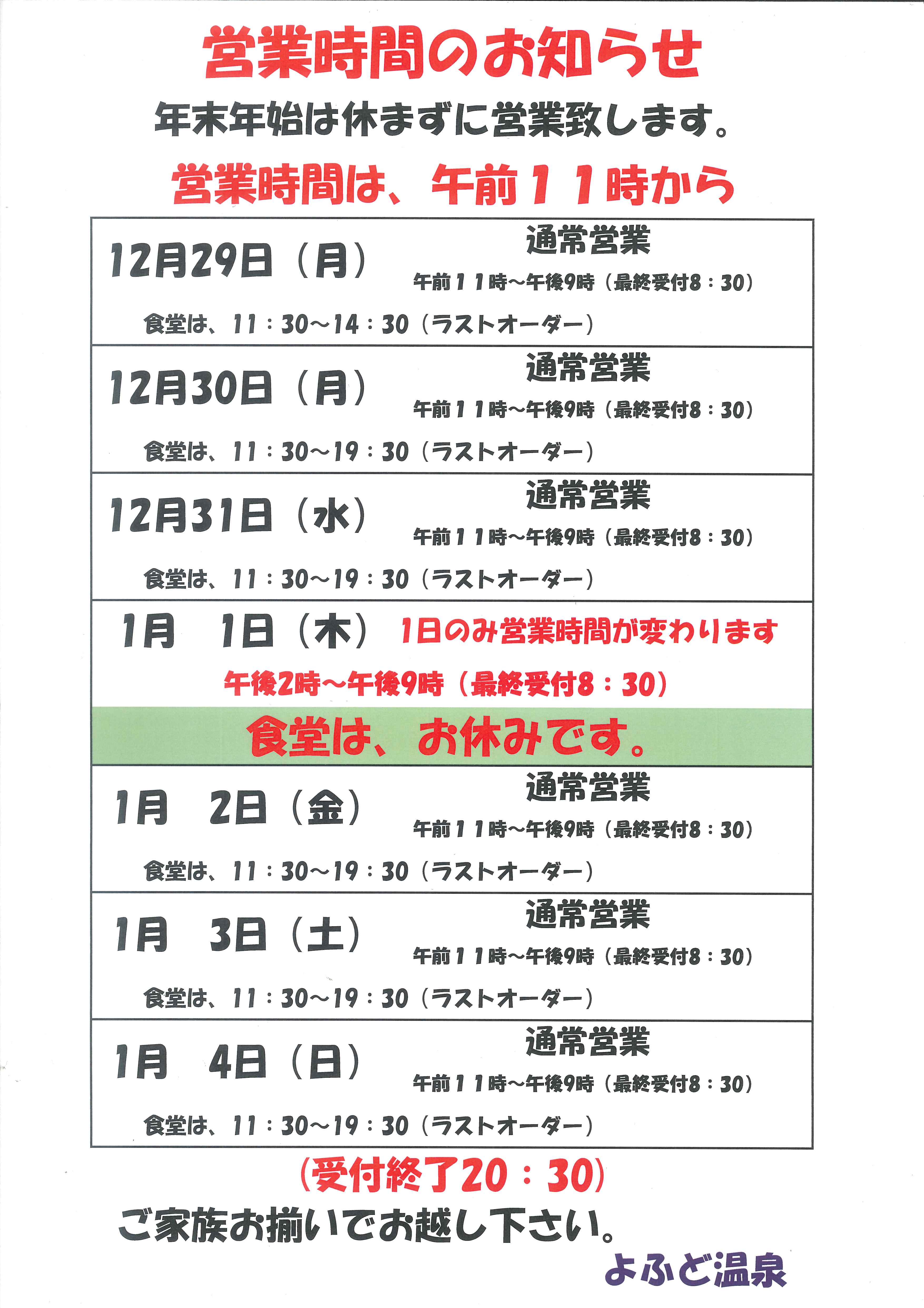 期間中の営業時間および食堂営業について下記の通りご案内申し上げます。